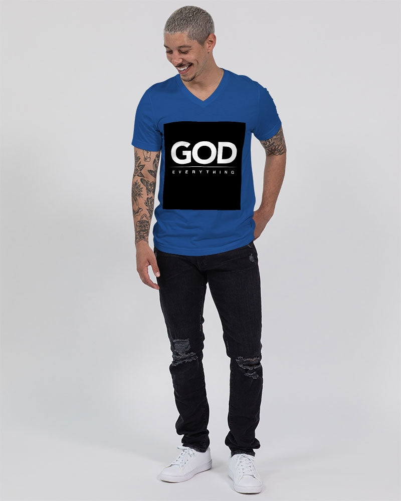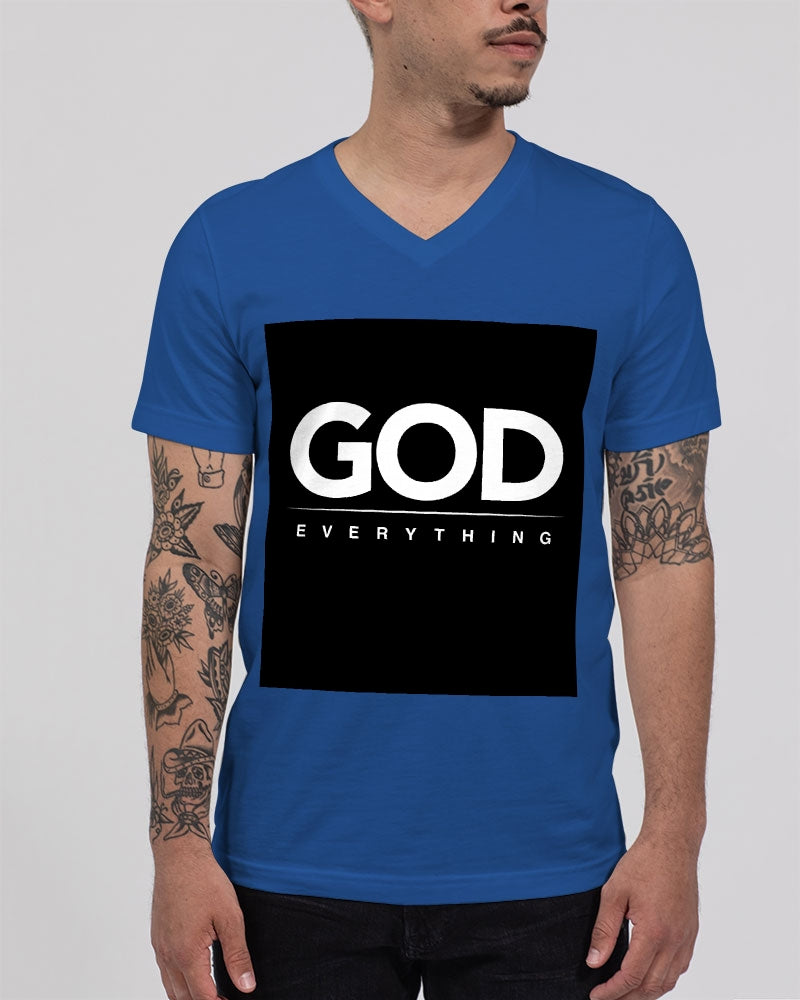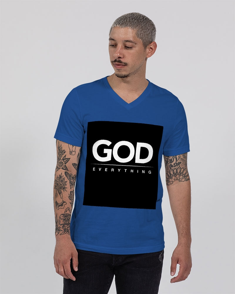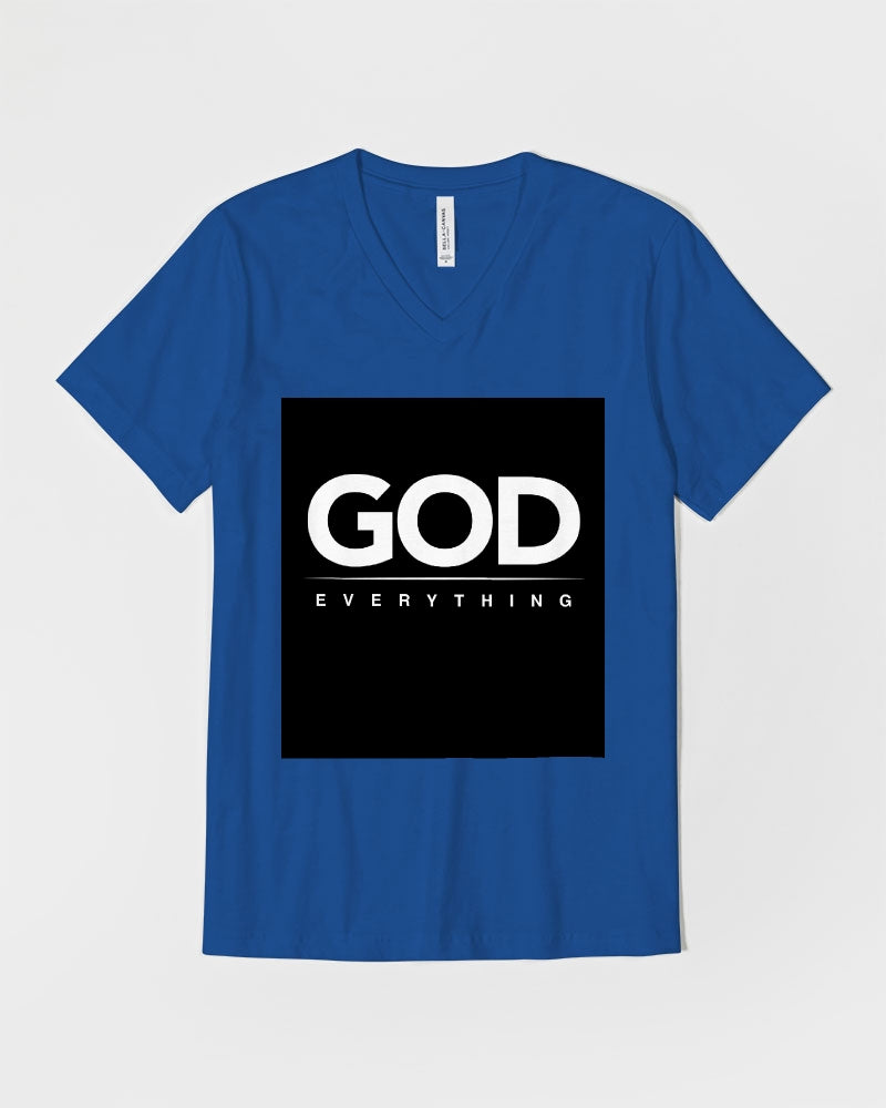 About The ArtGod over everything Product DetailsUnisex jersey t-shirt, featuring a classic V neck. Crafted in a soft and comfy fabric, is perfect for all-day wear. Pair this t-shirt with your favorite shorts or jeans for everyday style, or layer it under a button shirt. Bella + Canvas is known for their Retail Fit, which is more fitted than a standard t-shirt. They are designed to contour the body more closely with more form-fitting lines around the shoulders, arms, and torso.